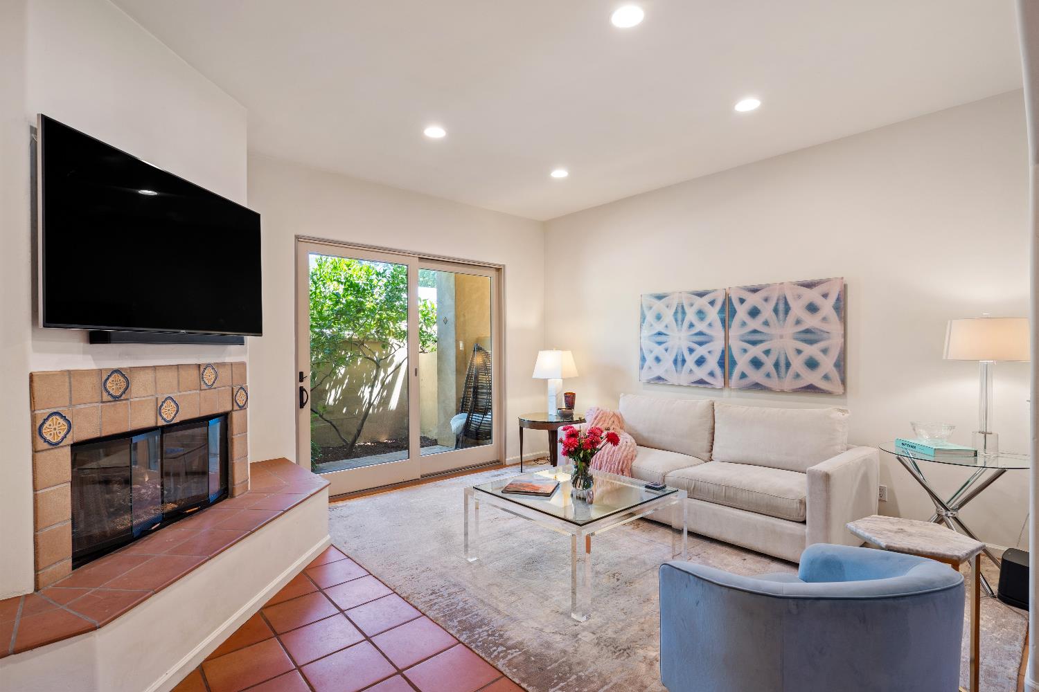 Outdoors, the private patio feels like your own garden oasis, complete with mature citrus trees and a cozy fireplace for evening dinners.