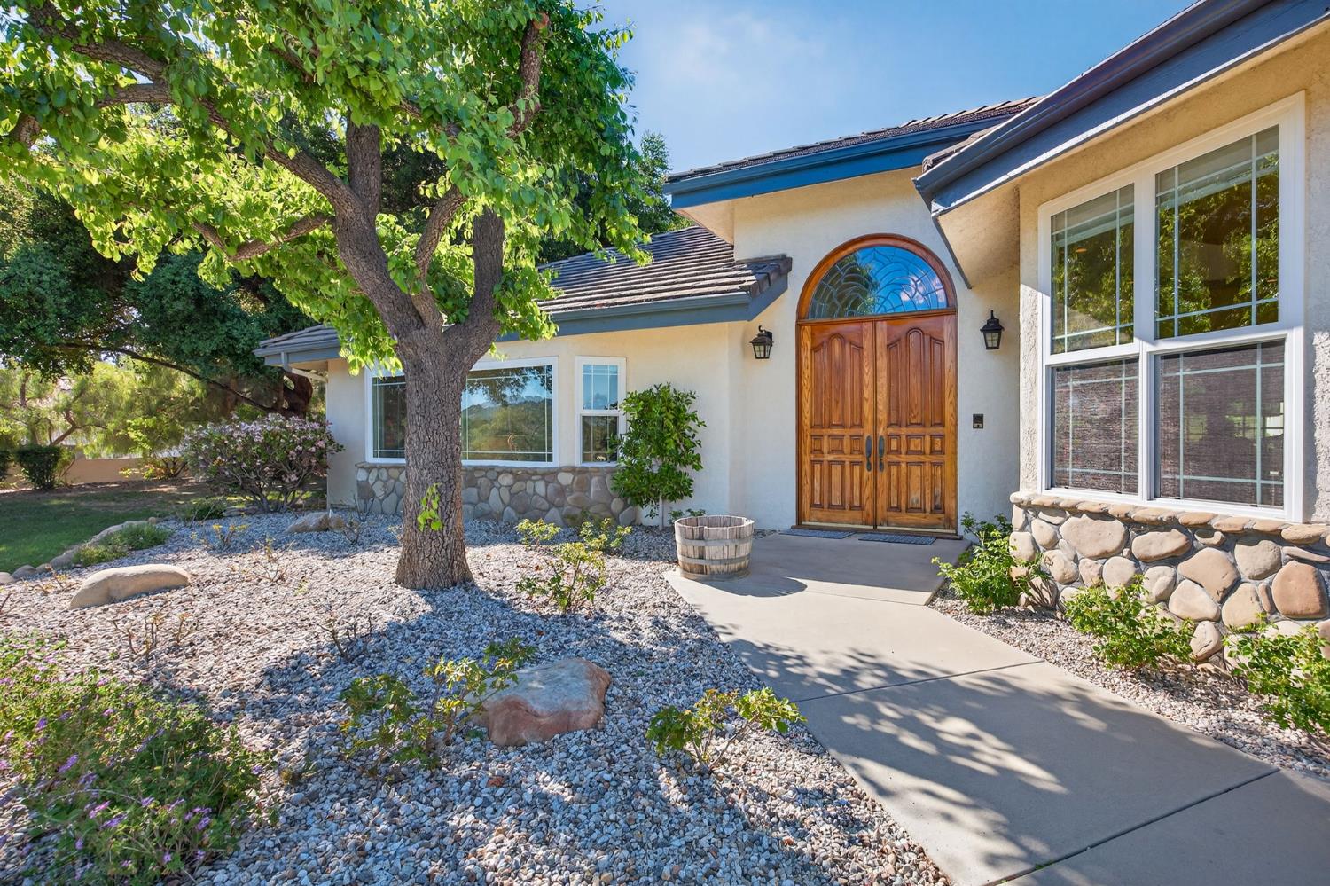 Step through the front door and be welcomed by soaring vaulted ceilings that open the space with effortless grandeur. The living room anchored by a warm fireplace and a handsome corner bar sets the tone for a home that is equally suited to quiet evenings in and memorable gatherings with the people you love. French doors sweep open to the expansive backyard, where a sparkling pool and spa await, a fenced corral sits ready for your horses, and majestic oak trees form a natural canopy over it all. Avocado and fruit trees dot the grounds, lending a sense of abundance.