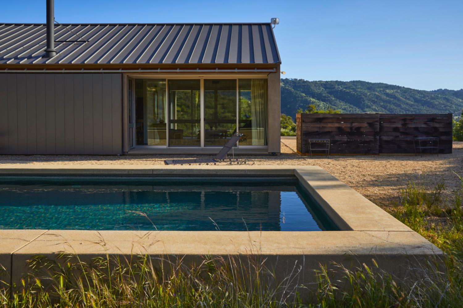 Surrounded by its gravel precinct, the light-filled, minimalist house sits amidst the trees and shrubs of the chaparral and includes three bedrooms and two baths. The cathedral ceilinged living, dining & kitchen flow into one another flanked by broad passageways and bookended by towering walls that demark the functions. To the North, the house opens to a 12' X 48' pool with views of the Topatopa foothills and beyond, to the mountain's iconic spalled face.