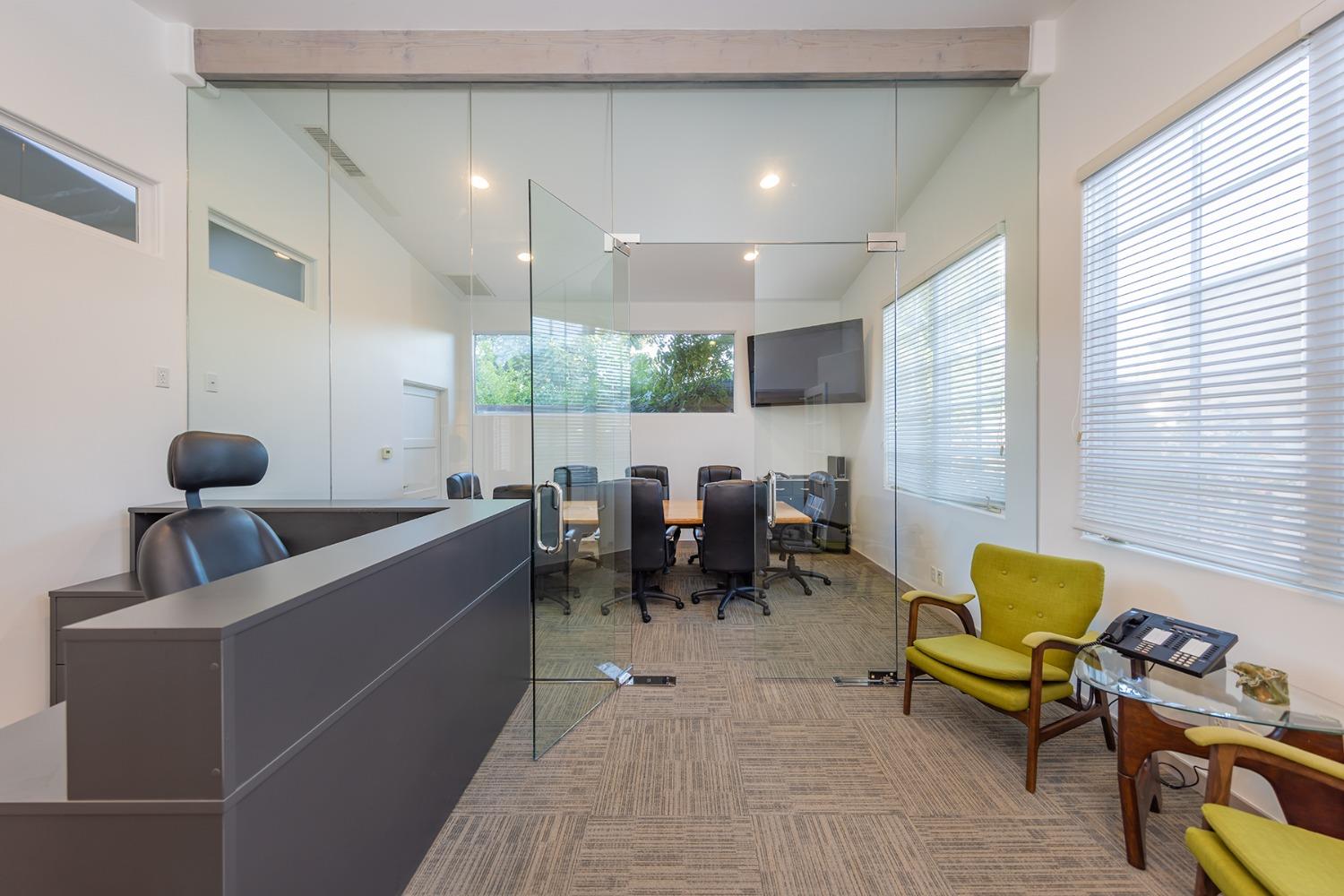 The thoughtfully designed interior features ten private offices, an inviting reception lobby, a spacious conference room, a well-appointed kitchen, and three bathrooms. Soaring ceilings and expansive windows flood the space with natural light, while refined finishesincluding tile and wood flooring, glass partition walls, hand-hewn beams, and striking black hardwarecreate a sophisticated yet welcoming environment.