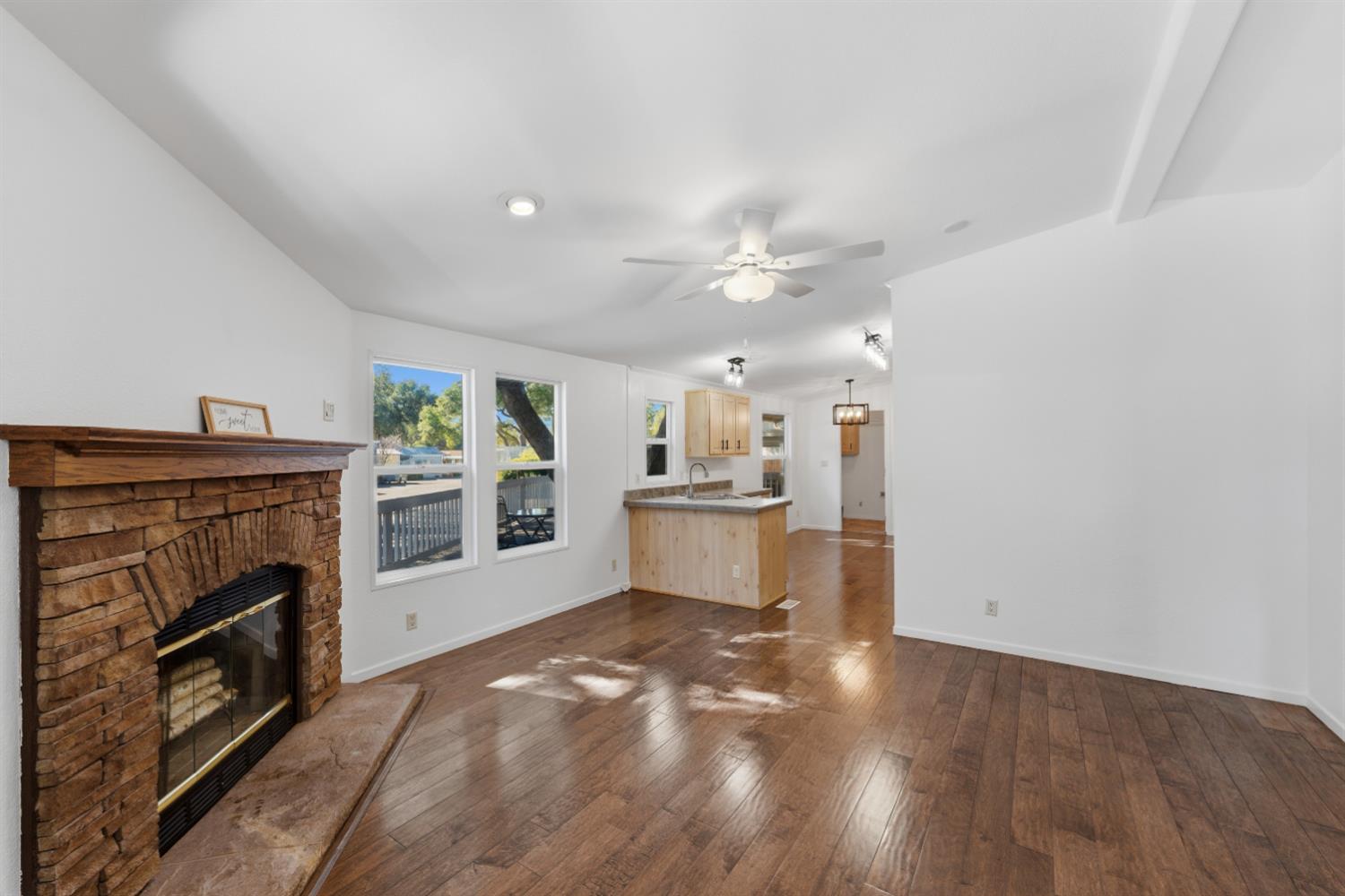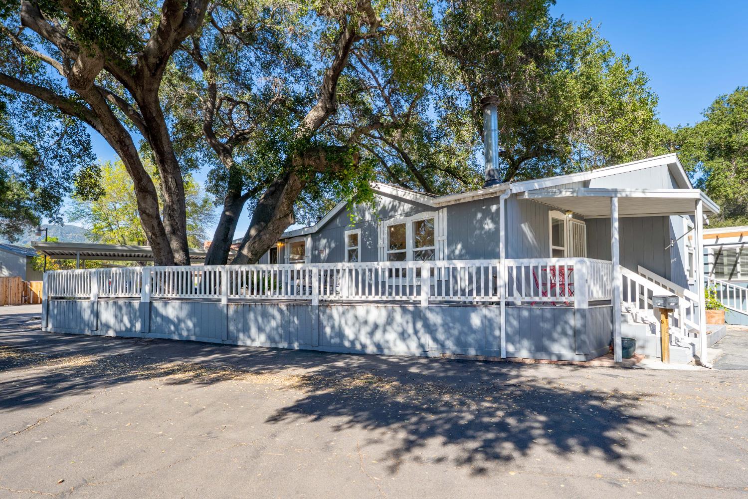Situated in the highly desirable Golden Oaks 55+ Community, this 3 bedroom 2 bath home built in 2003 offers over 1200 sqft. of living space, a generous patio deck and a fenced in side yard off the primary bedroom. With an open concept and a natural wood burning fireplace in the living room, the home features a private master suite on one wing and two additional bedrooms on the other wing. Freshly painted inside with new carpet and gorgeous hardwood floors. Additional upgrades include a newer roof in 2025 and updated light fixtures. The park amenities include a pool, clubhouse, dog park, community garden and RV parking. The low monthly space rent of $941 includes trash, water and sewer. With an abundance of Oak Tree's gracing the park for privacy and shade and a convenient location next to the Trolley stop, hiking trails and Lake Casitas, this low maintenance home is move in ready!